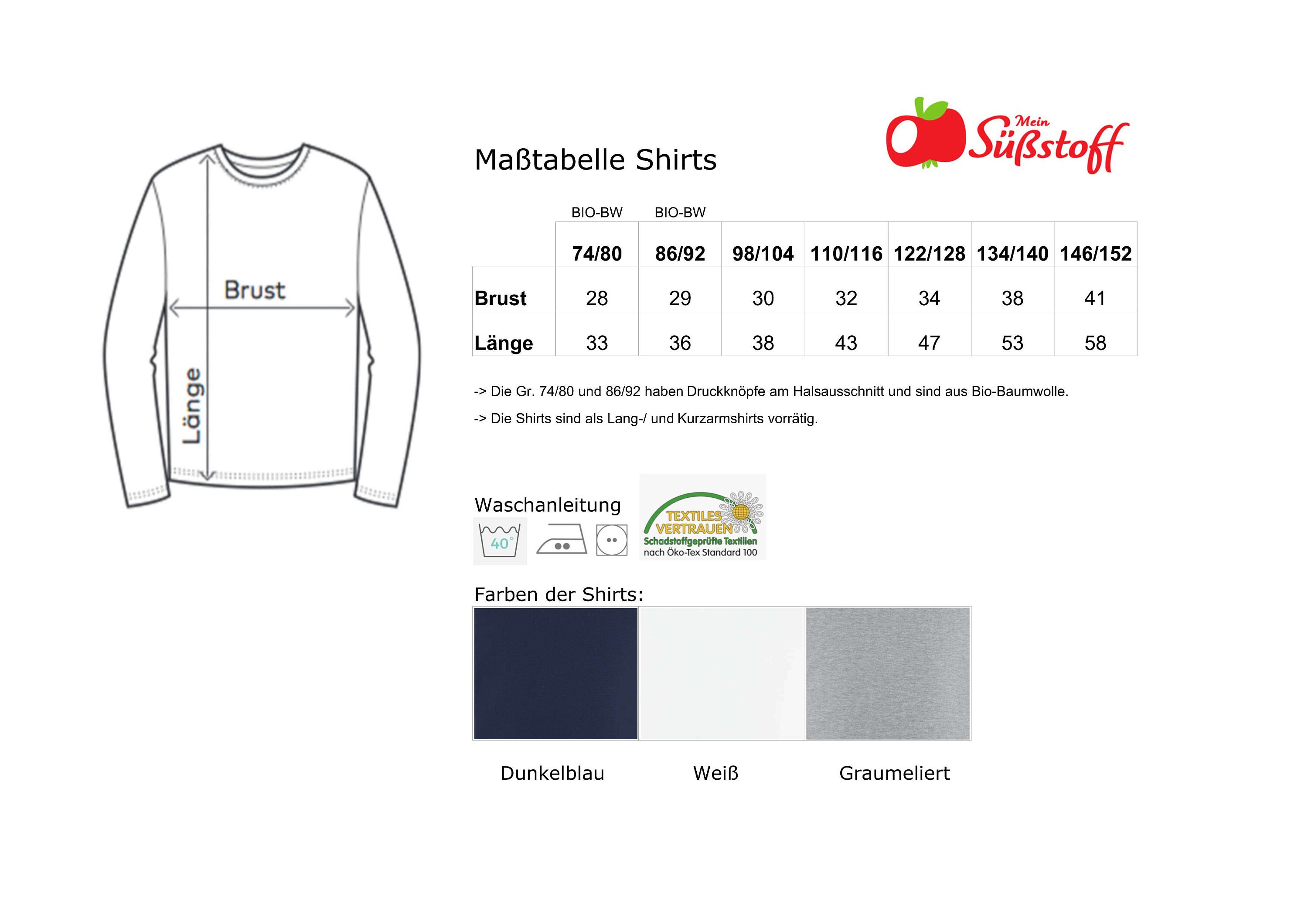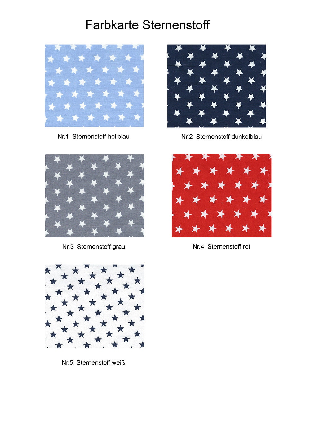 Other colors of the star fabric are possible, see color chart. The available sizes for the long-sleeved shirts are 80 - 152. The shirt colors we offer are: dark blue, mottled gray, white, pink. Also available as a short-sleeved shirt in sizes 92 - 152, please inquire about the size in advance!