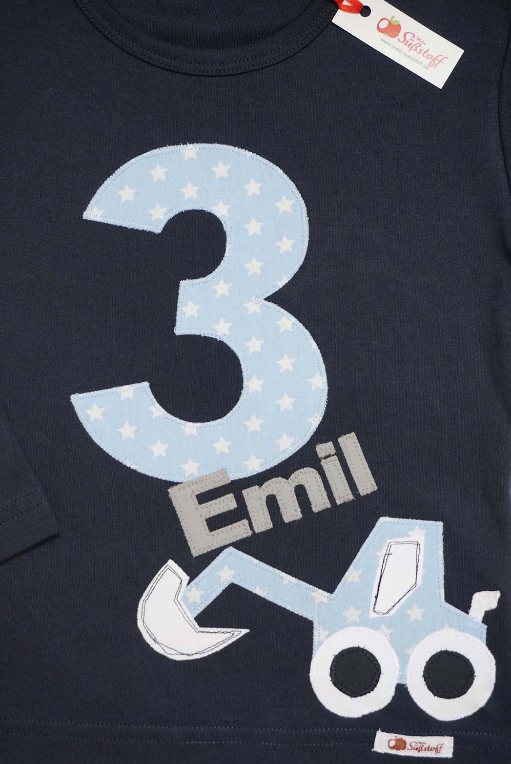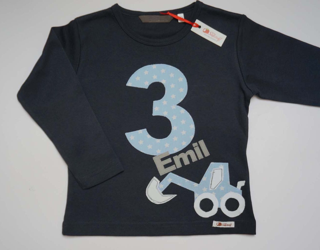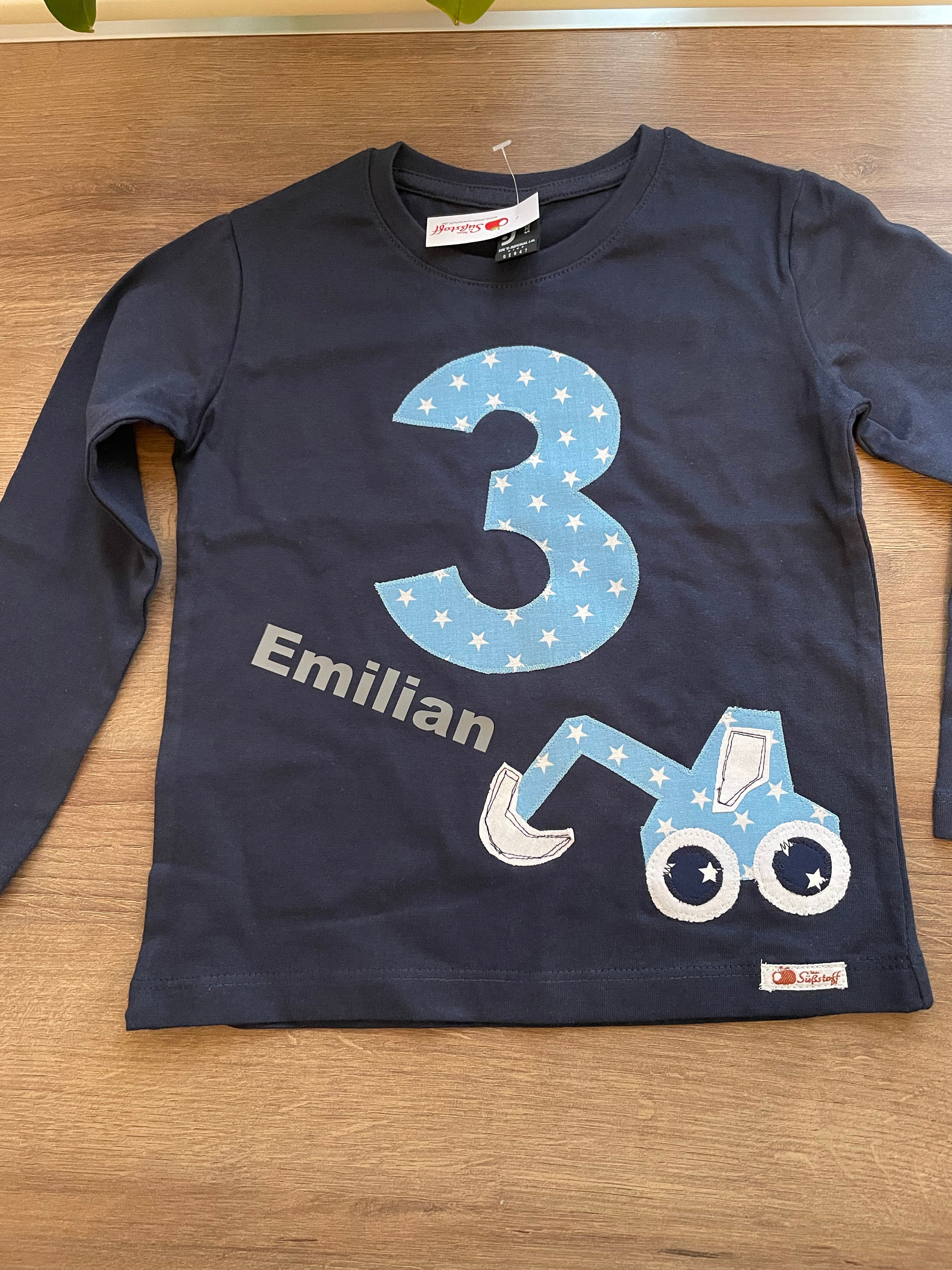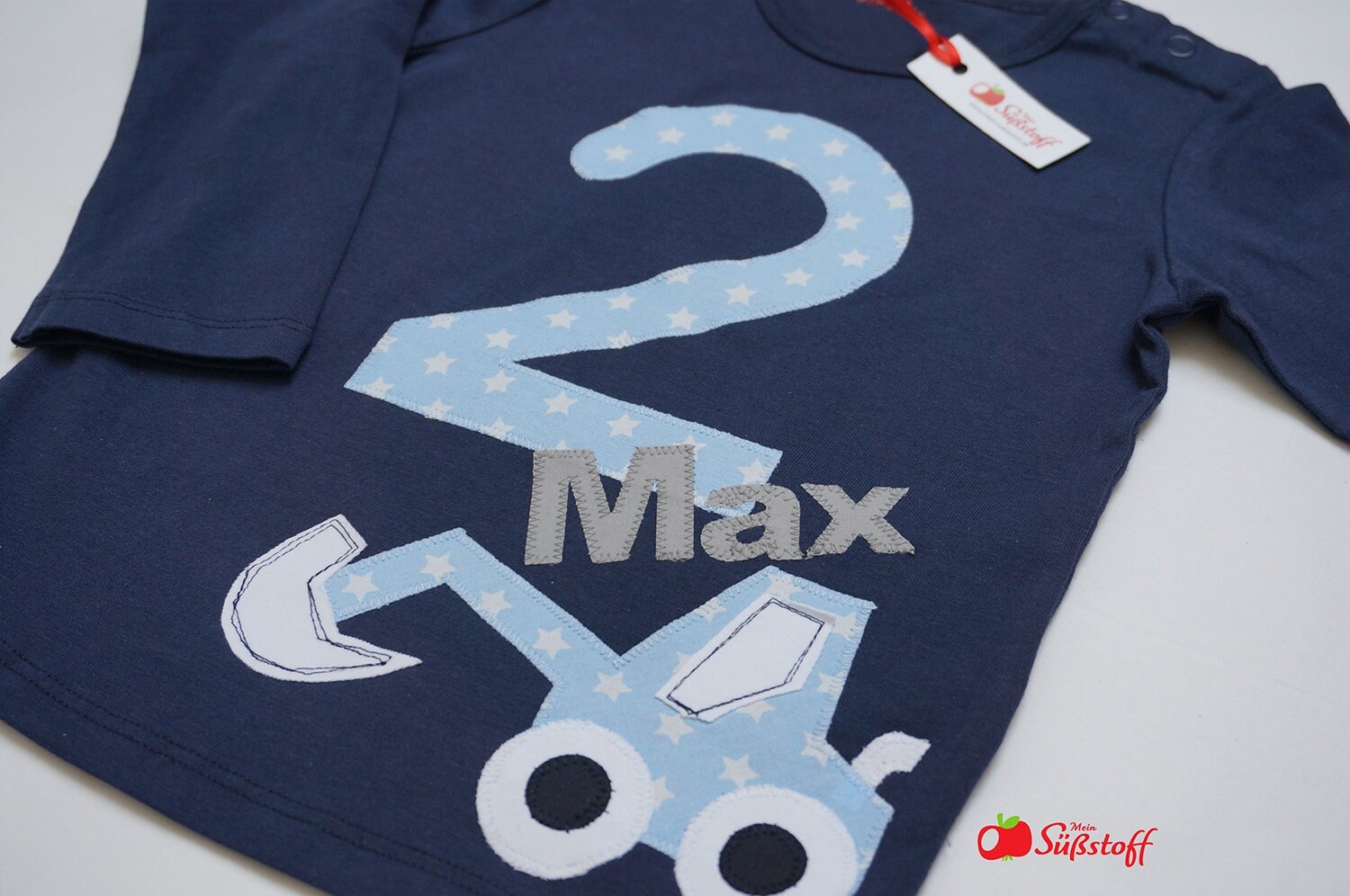 A great personalized birthday shirt for boys with a number and excavator made from light blue star fabric. We are happy to personalize it with your desired number and optionally the name of the birthday child.