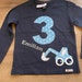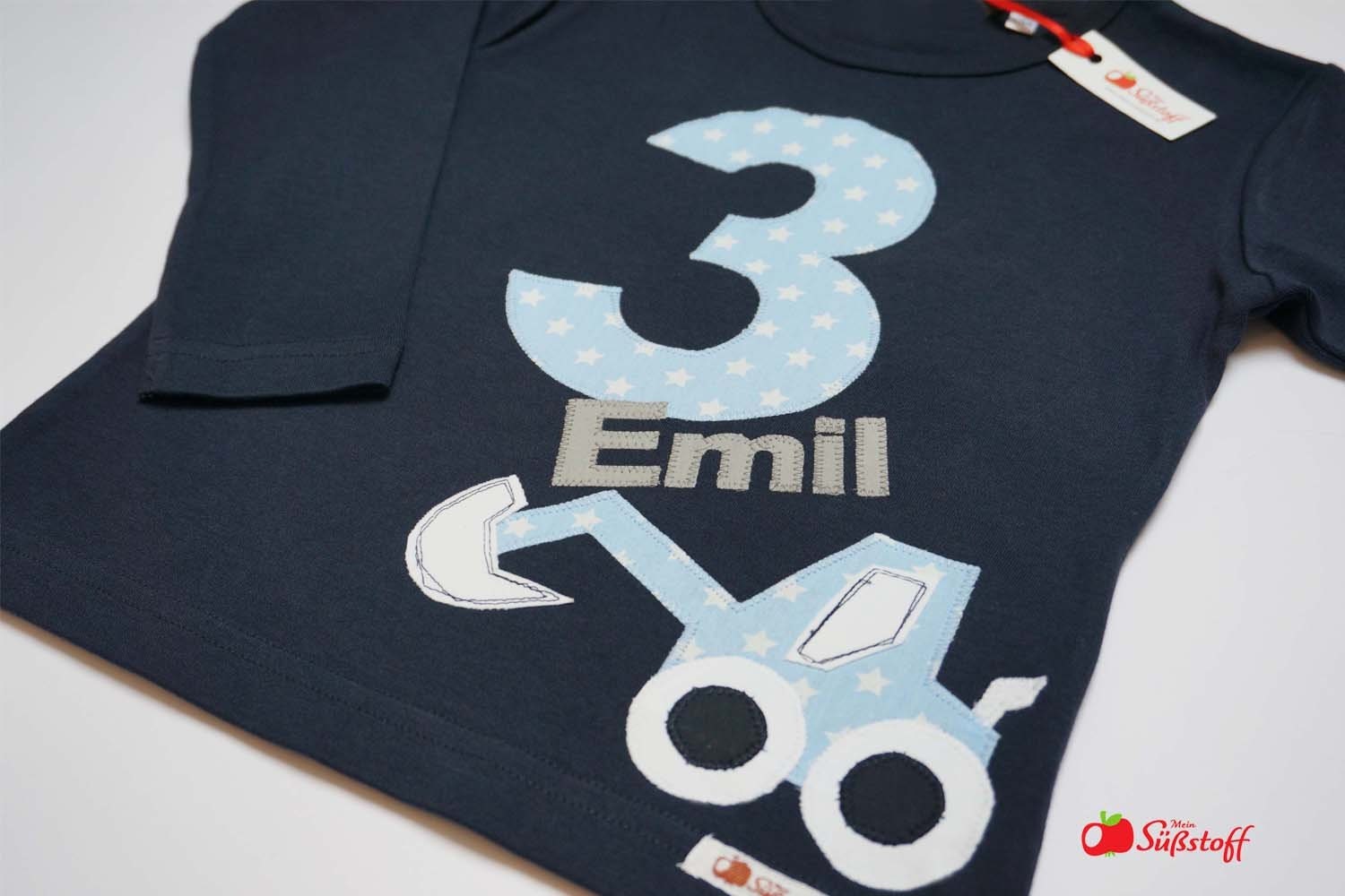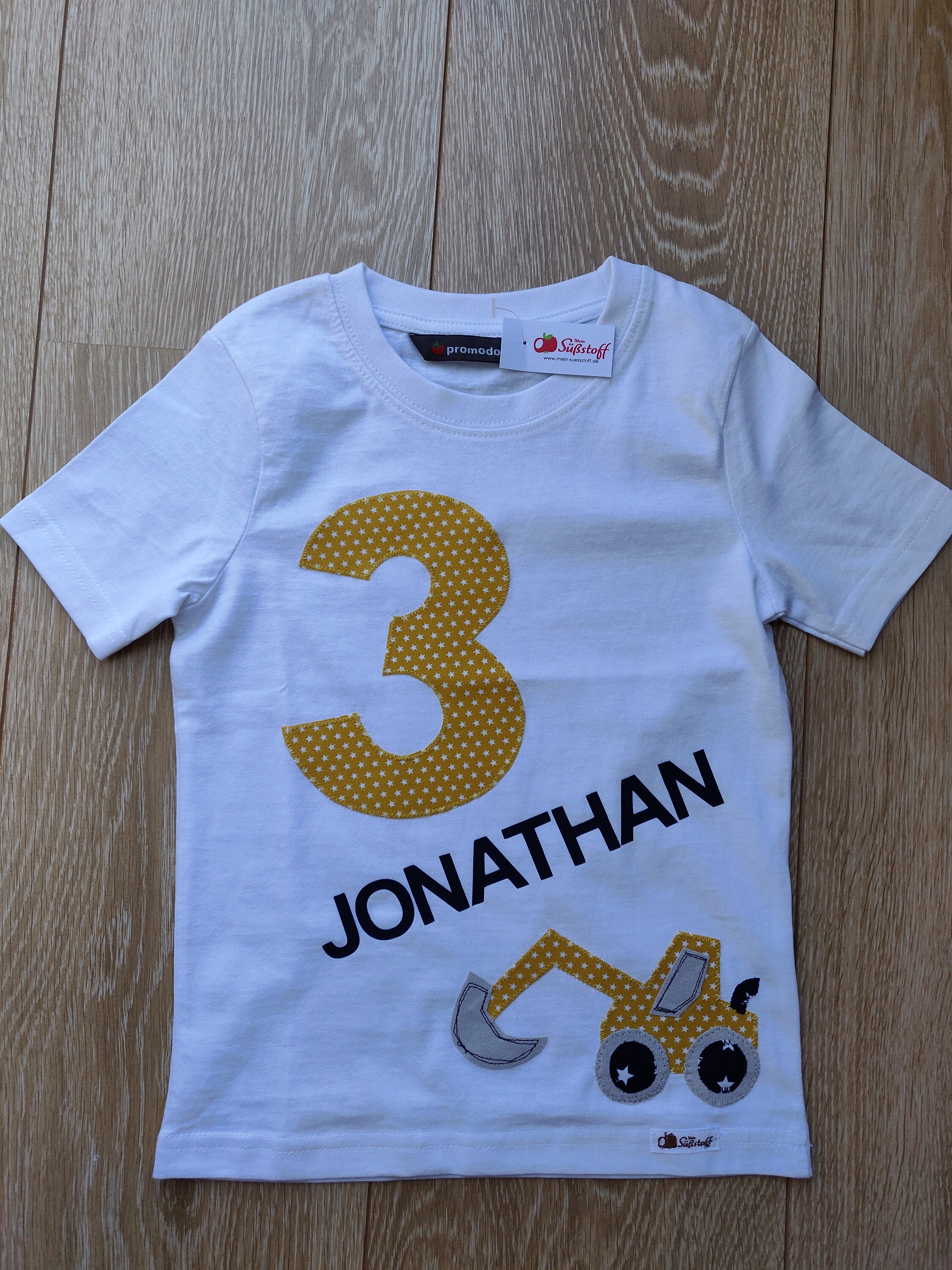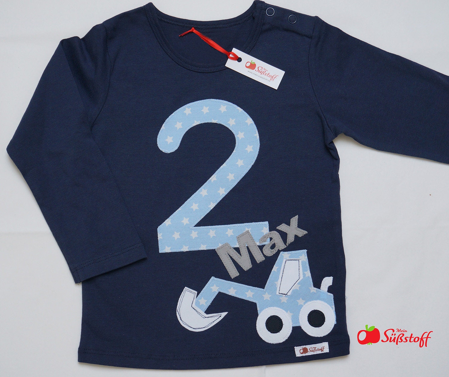 A great personalized birthday shirt for boys with a number and excavator made from light blue star fabric. We are happy to personalize it with your desired number and optionally the name of the birthday child.